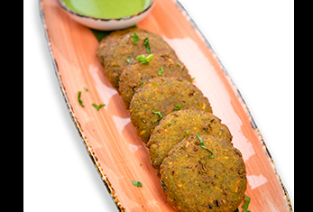Панир пакода, ведж пакода, онион баджи, алу тикки, ведж самоса. Подается с мятным и тамаринд-соусами