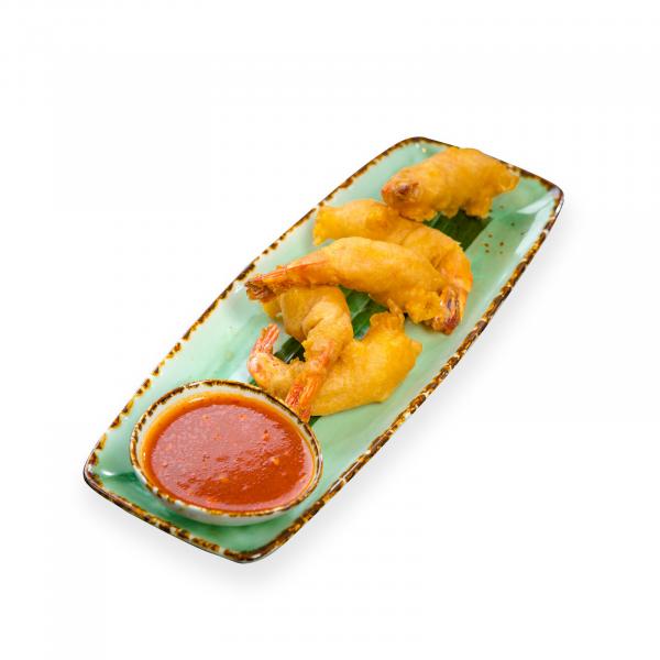 Королевские креветки в кляре. Подается со сладким чили соусом