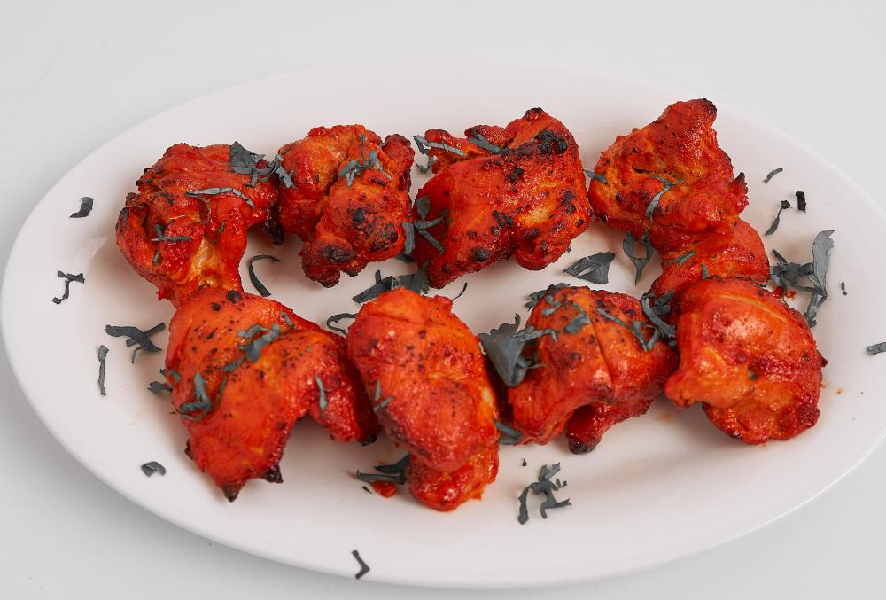 куриные крылышки тандури со специями маринуются в смеси йогурта и специй, а затем готовятся в тандыре