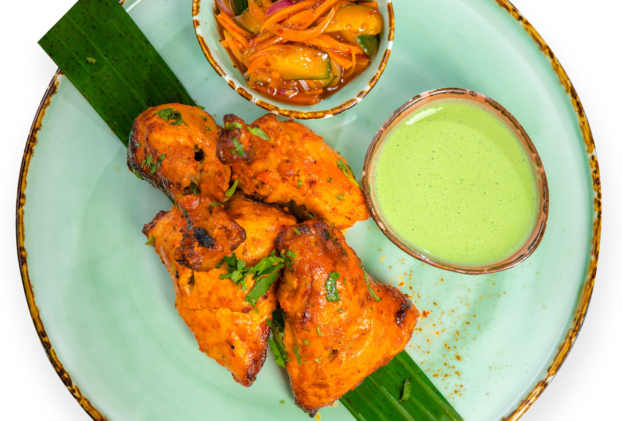 Сочные кусочки филе цыпленка со специями. Подается с мятным соусом и тандур салатом